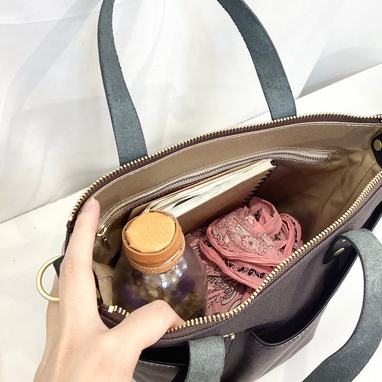 鋲付きの四角い底面で、手帳やペットボトルなども収納しやすくなっています。