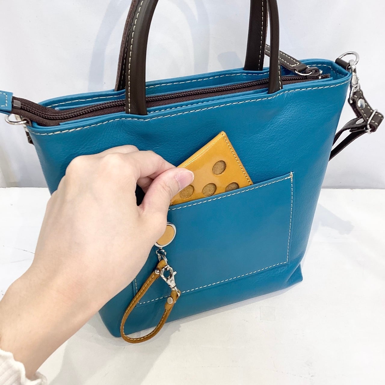 付属のレザーベルトによってショルダーバッグとしてもお使いいただけます。